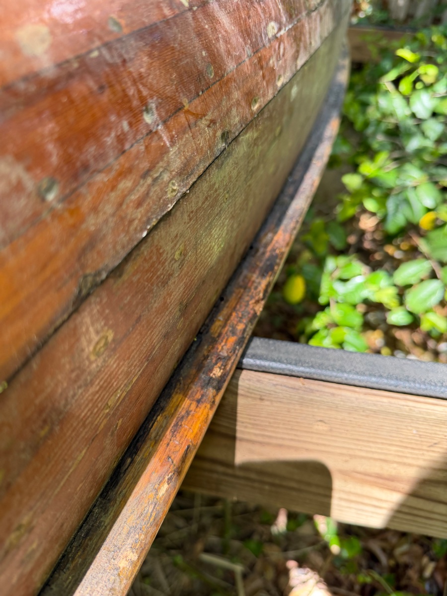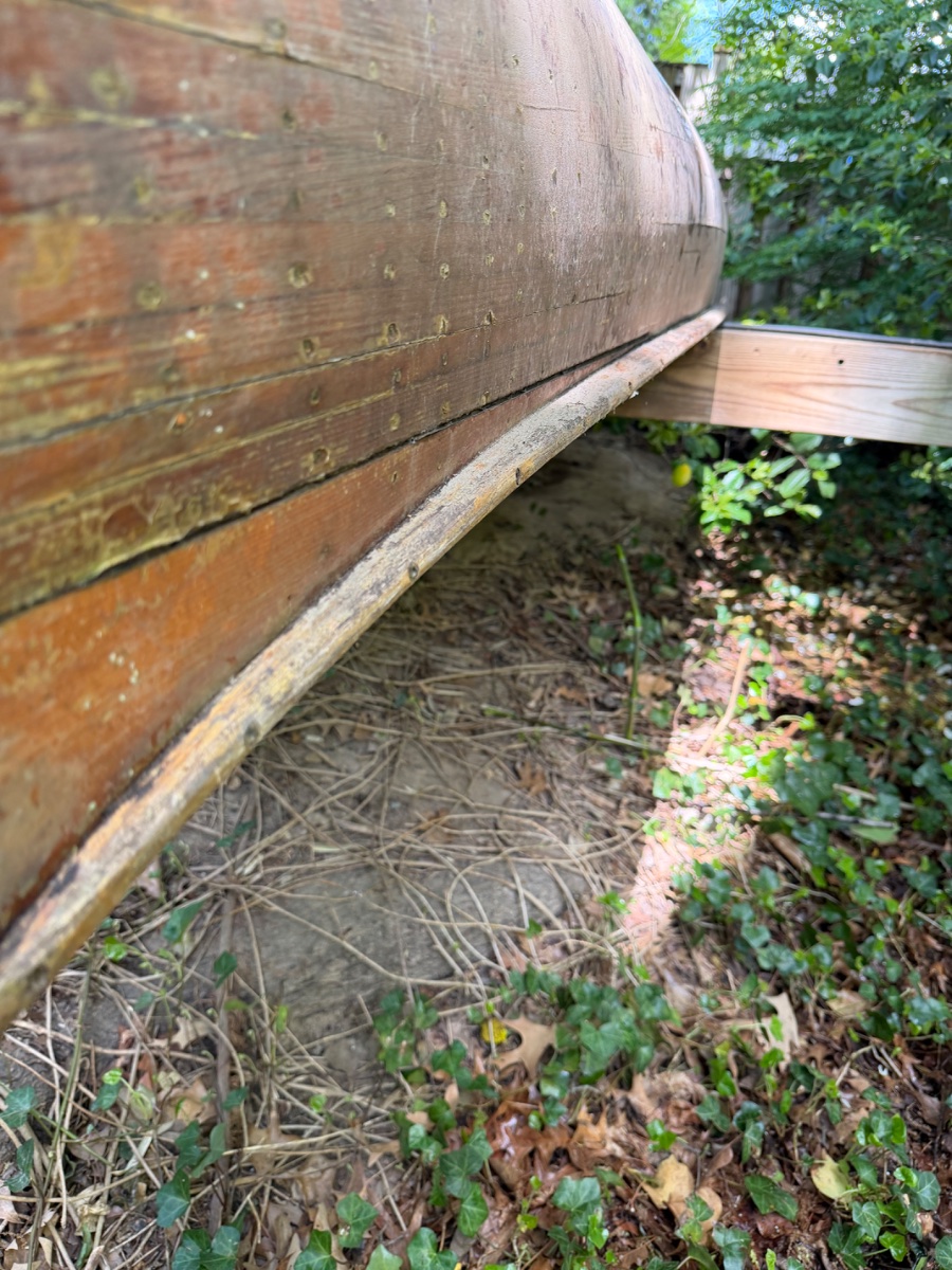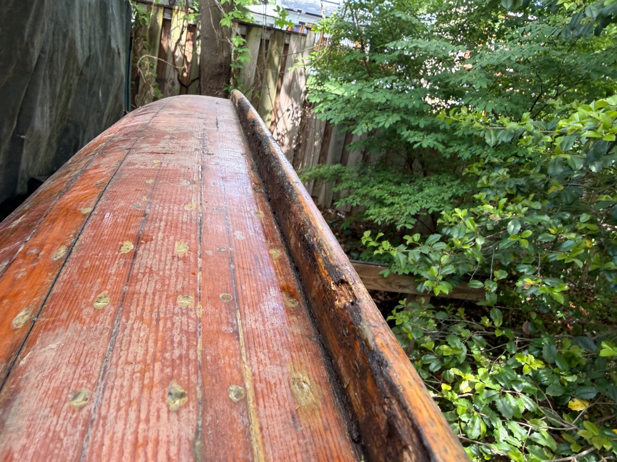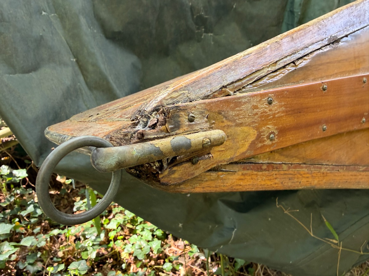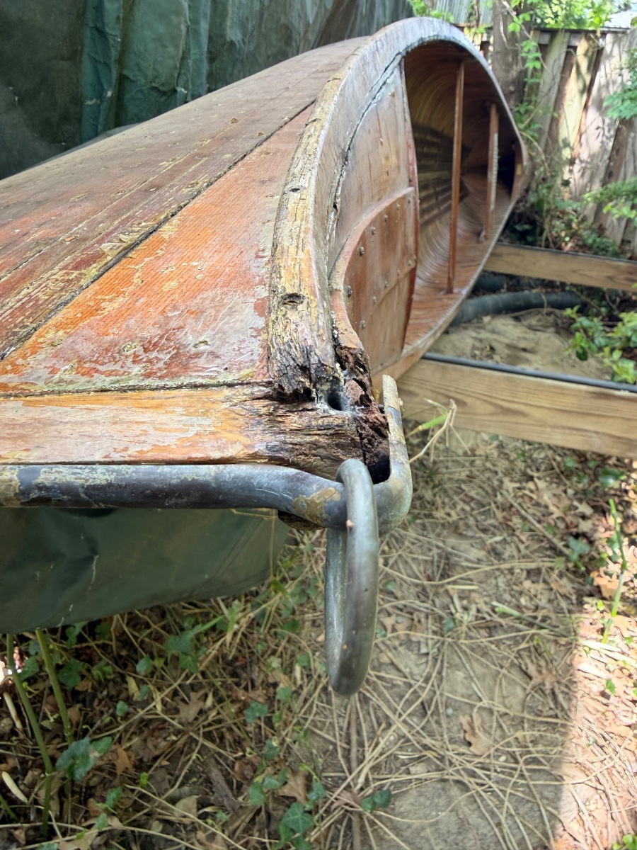 It’s been up in the air but under a tarp in his backyard since 2009. The hull seems very sound but the gunwale is rotted and needs replaced as well of some of the deck where it meets the bow and stern. It will need some work but I don’t think anything super extensive. It was stored upside down and from what I can tell some moisture got trapped on the backside of the deck and gunwale and sat. The rot seems localized only to that area.