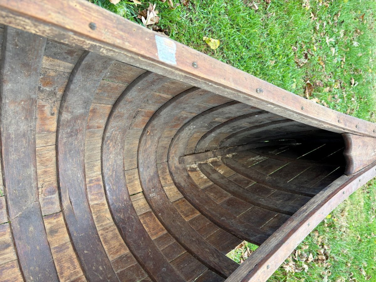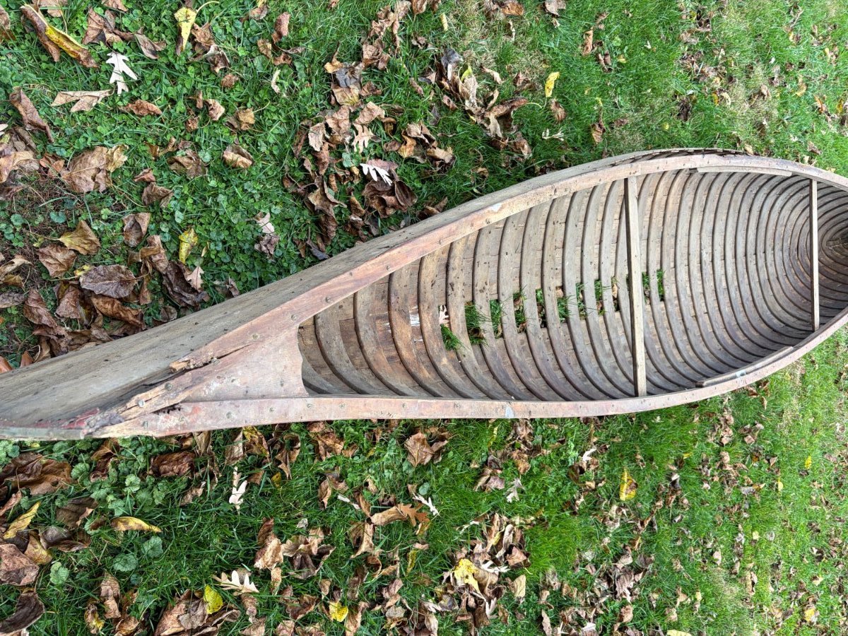 Yes, I am the guilty party. Jean and I went to Dutchess County and picked it up for Dan. It's in my barn now. 15' long, 32" wide, 12" deep, beveled planking. a few broken ribs, some bad planking etc. - the usual issues. I'll let Dan expand on it further when he has it at his place. It will be a nice little canoe when it's restored. I guess you have to rotate your head 90 degrees to see the pics correctly.