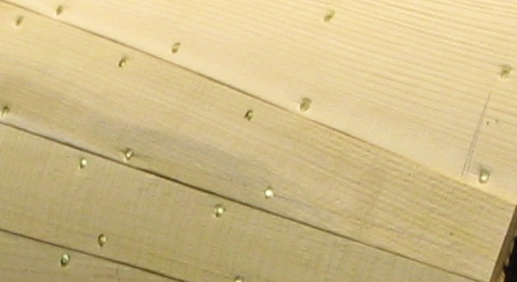 The builder makes an effort to butt the planking, but since water tightness is not a requirement, gaps are not a problem. Adhesive is never used. Once the hull is finished, it is covered with a canvas that is then stretched, filled and painted. That is the waterproof element in this style of build.