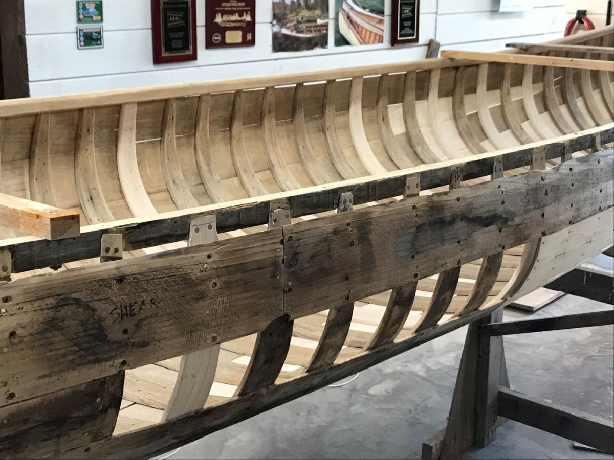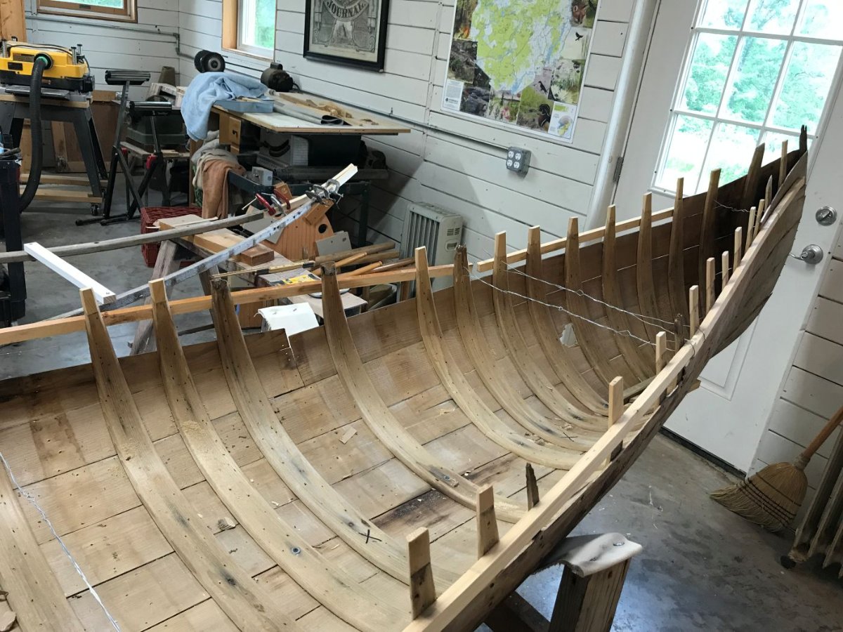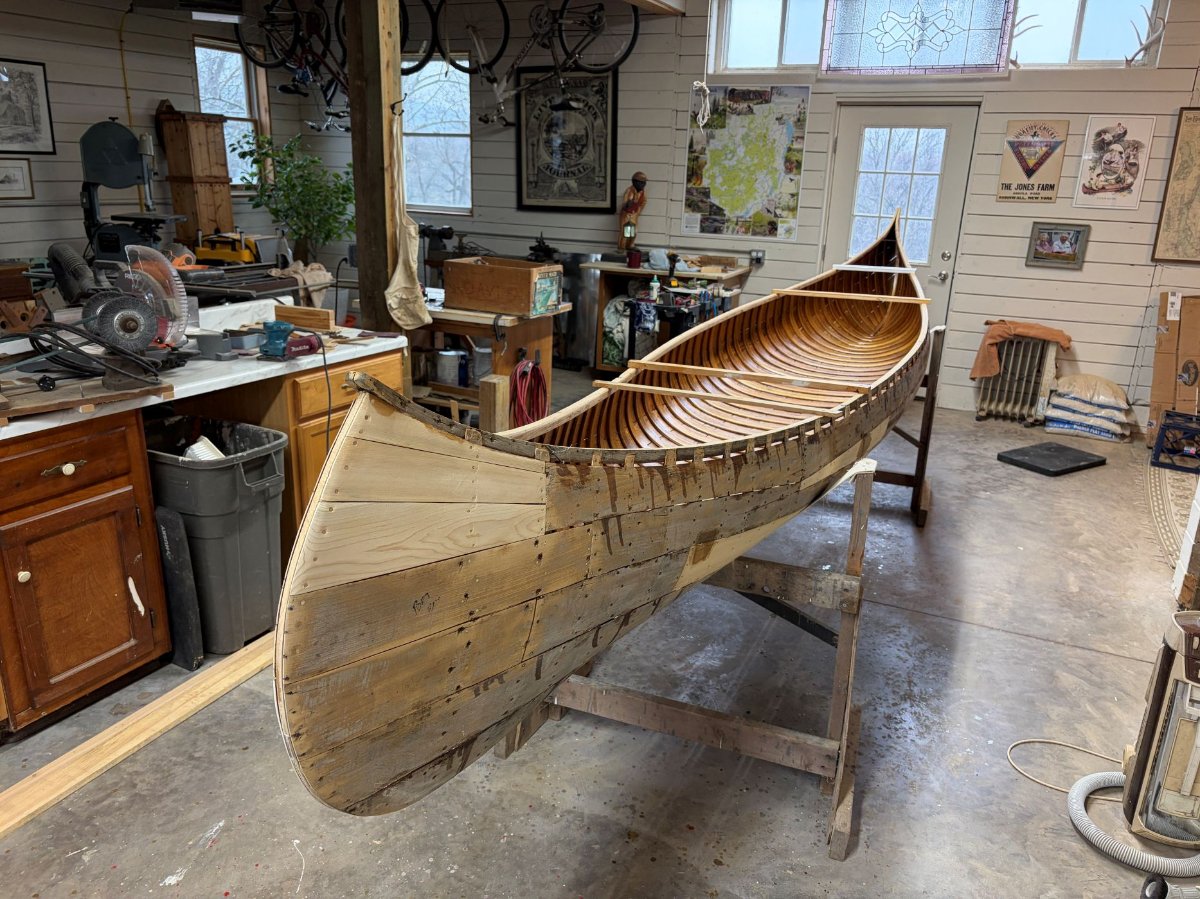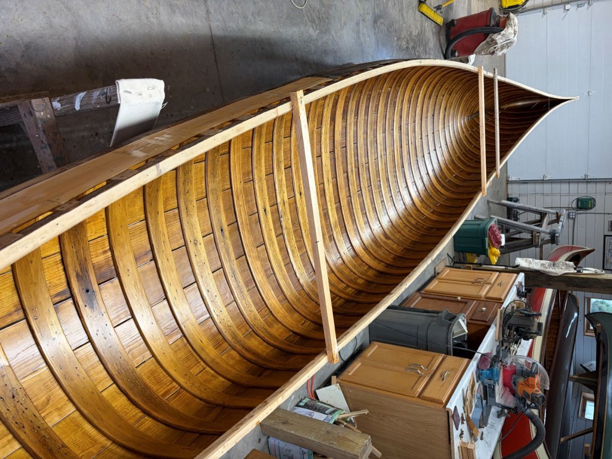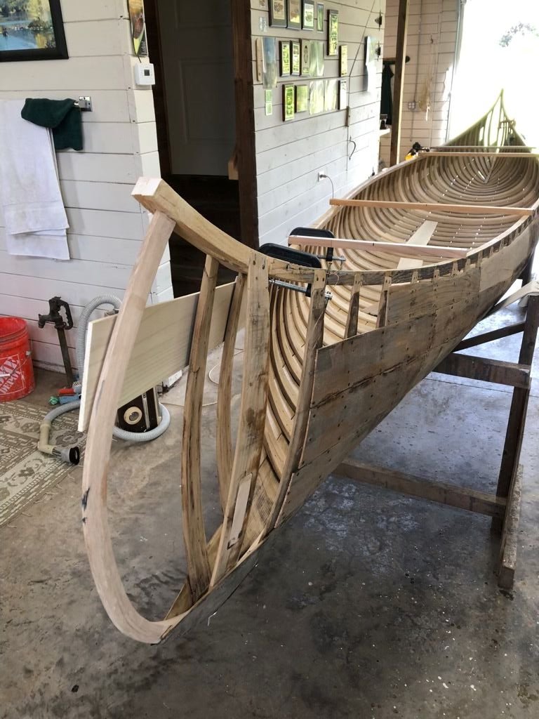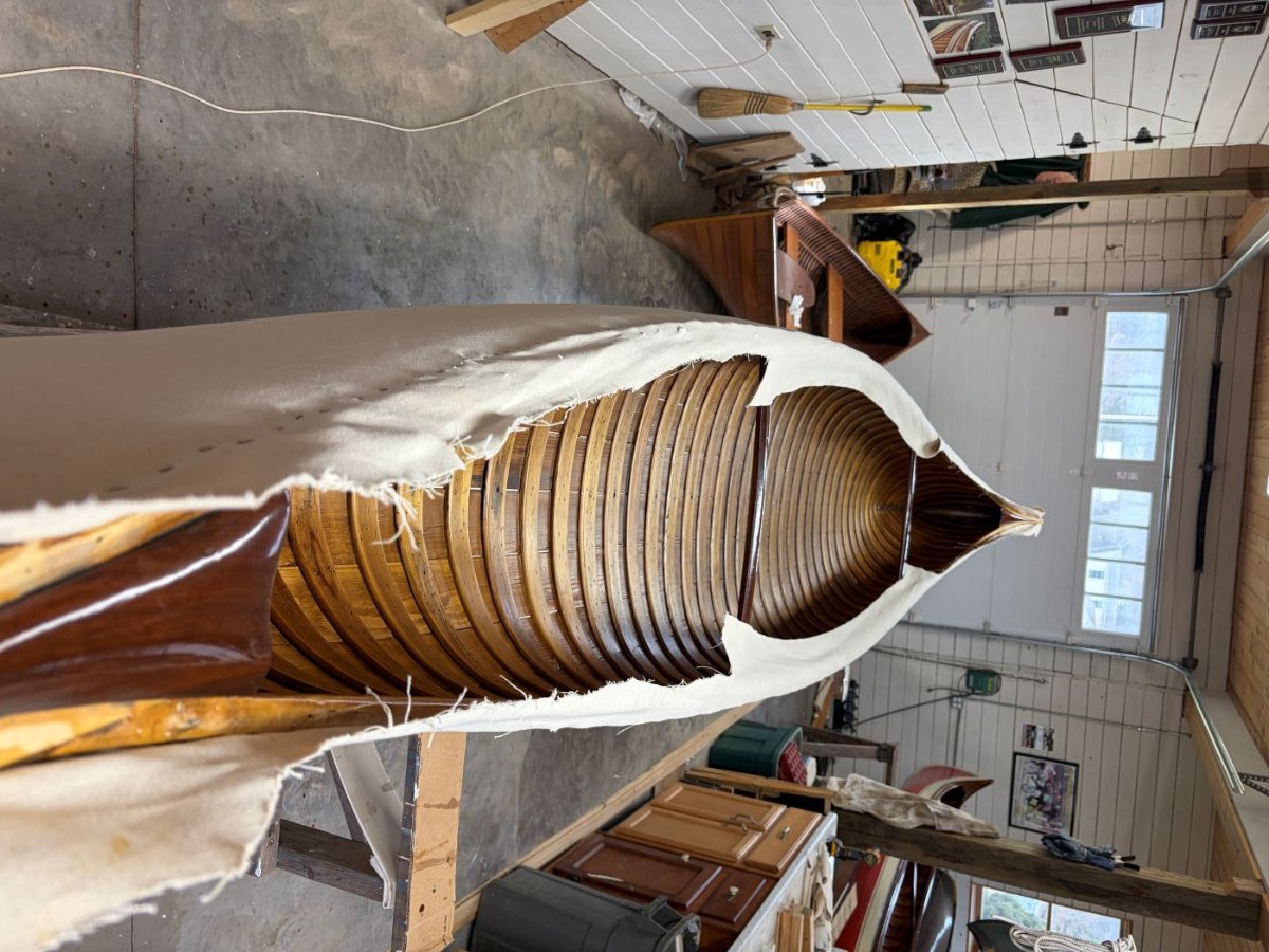 I replaced twelve full ribs, two cant ribs and did backside repairs on two others. I repaired or replaced the tops of nearly every rib. I replaced the entire stern stem and at least a foot of the bow stem. The tips of the inwales on the stern were replaced. I replaced nearly 50 feet of planking. I made a new center thwart. The new ribs and planking were stained and the varnish completed. The canvas was installed this past week and filler laid on. While that is drying I will cane the seats and start making new gunwale caps and keel.