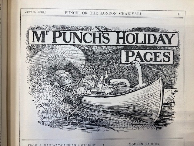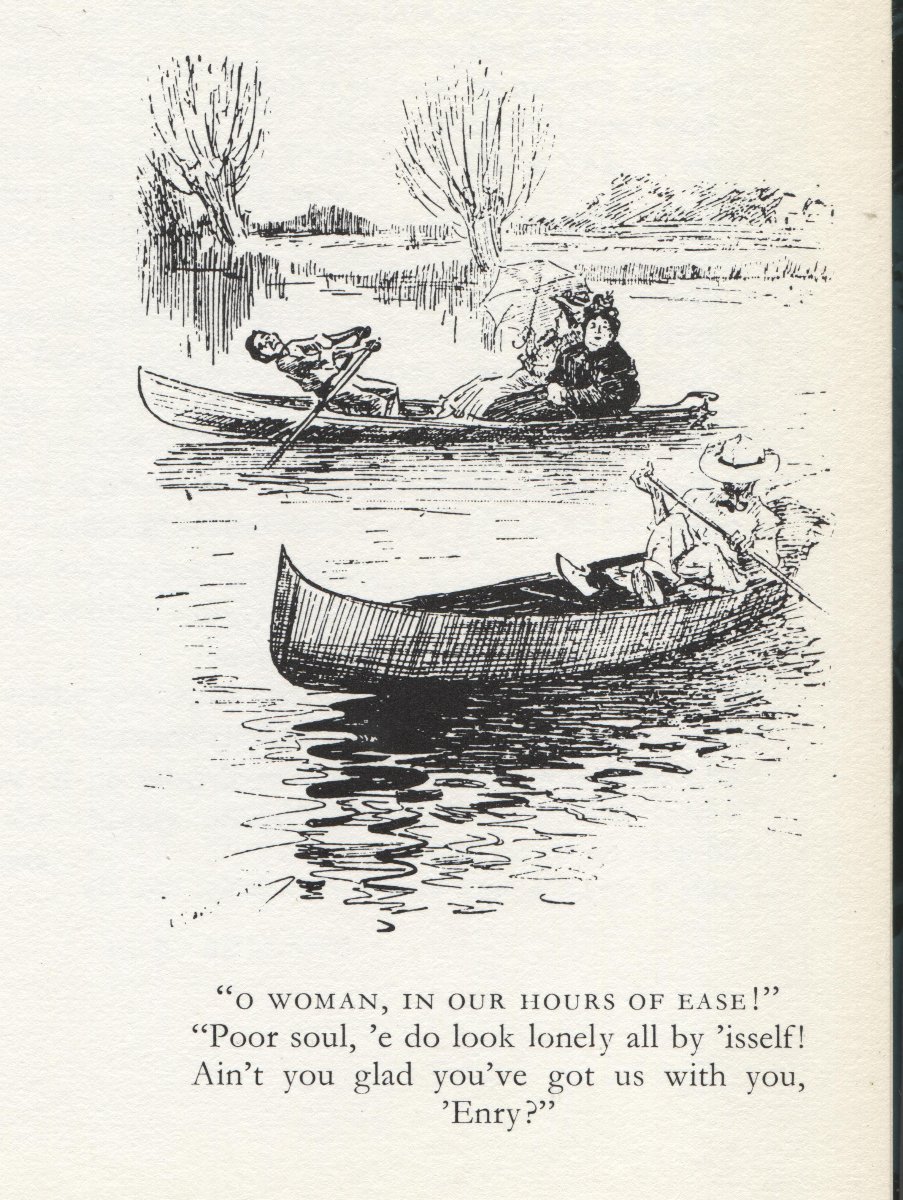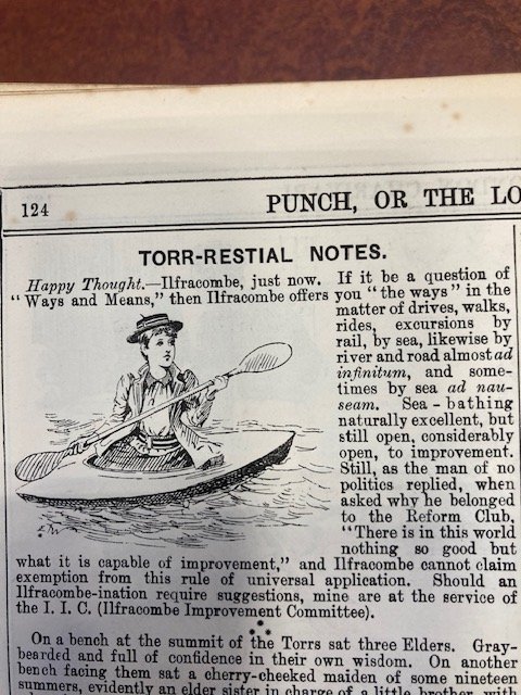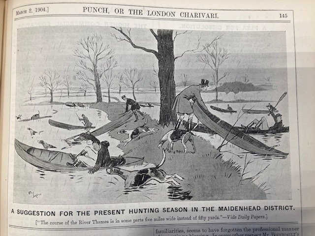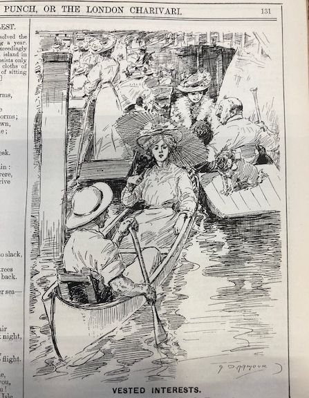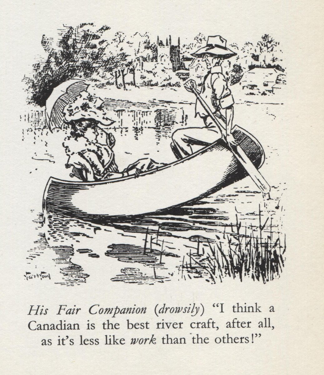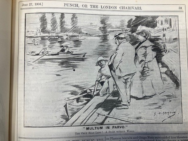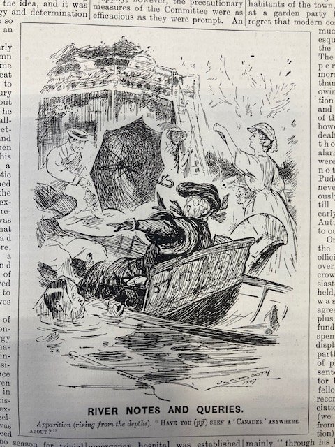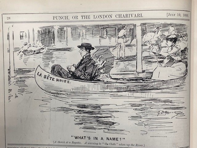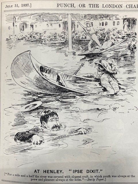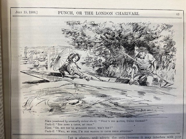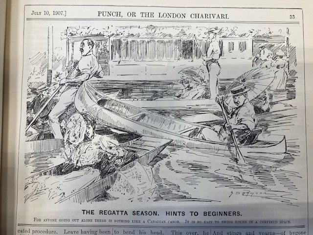 My Strickland was imported into England between 1894 and 1904, so I started looking for images in 1894 and continued to 1914. I chose Punch magazine, which operated between 1841 and 2002, because it reflected the life of, and was therefore bought by, the leisured classes, the ones who could afford a canoe. There was not much, mostly one annual cartoon at the time of the Henley rowing regatta, which brought huge crowds to the Thames, west of London. The artists were used to rowing boats and punts but it took a little while to get used to drawing canoes. The first picture (1894) appears to be roughly a 'Rob Roy'.