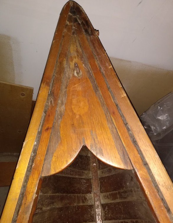 Recently obtained what appears to be Canadian Canoe Co Model 50. Might be an earlier construction but looking for feedback to confirm. Completely faded shield decal appears on a heart shaped deck. Ribs are 2-3/8" tapering to 1-3/4 at the tops. Planking looks to be Western Red and is quite wide, just under 4". Has a single thwart which is not centered but set further to the stern. Inwales appear to be spruce while outwales have been replaced with some sort of homemade, bulky version that is both nailed and bolted on and go well past the deck tips. Caning on the seats is long gone, replaced with a plywood plank but the the seats are hung with bolts and square shaped dowels. Wondering if any other folks have a Model 50 to compare. The few that I've found online seem to have semi-circular decks and non-tapered ribs.