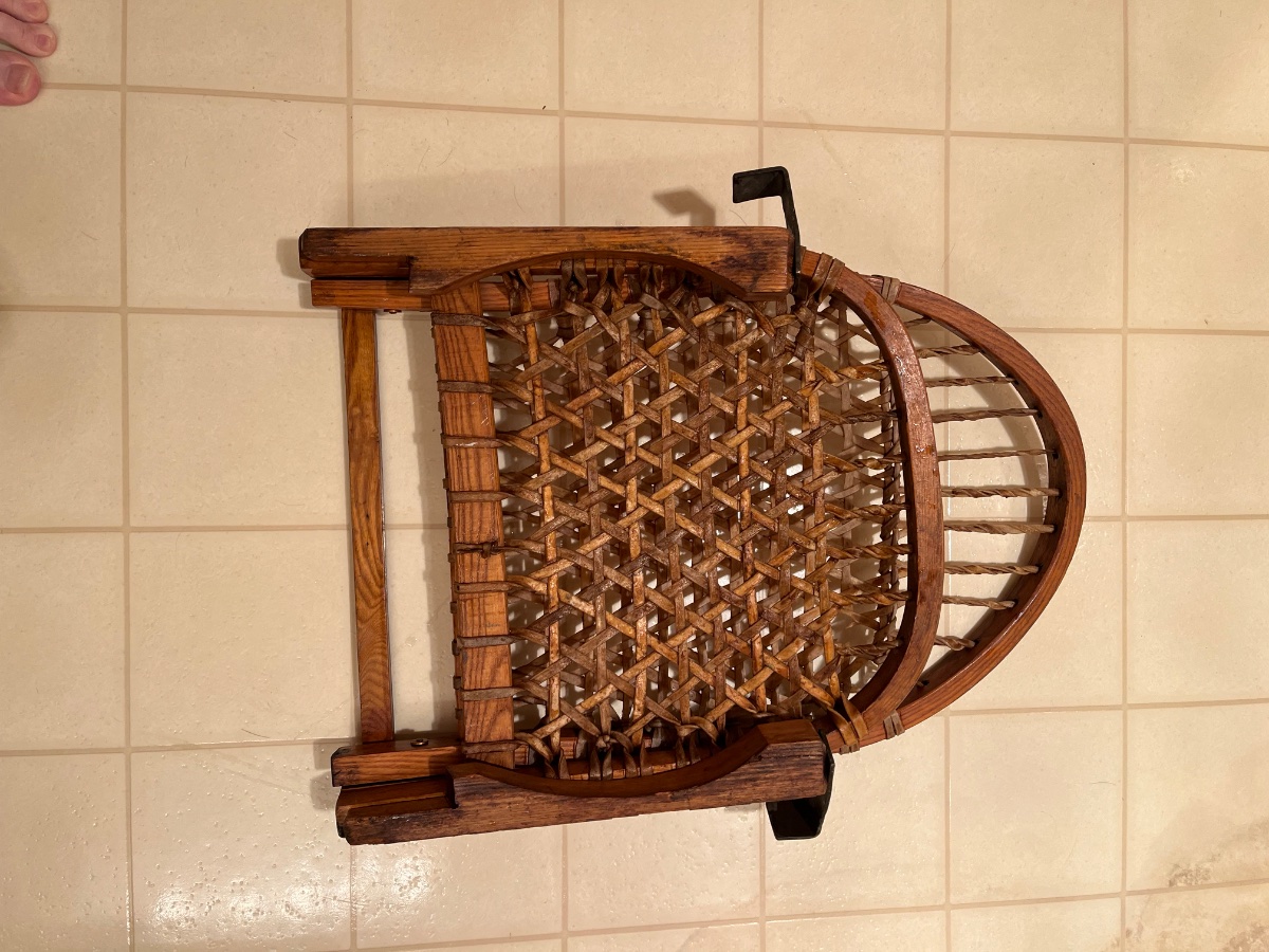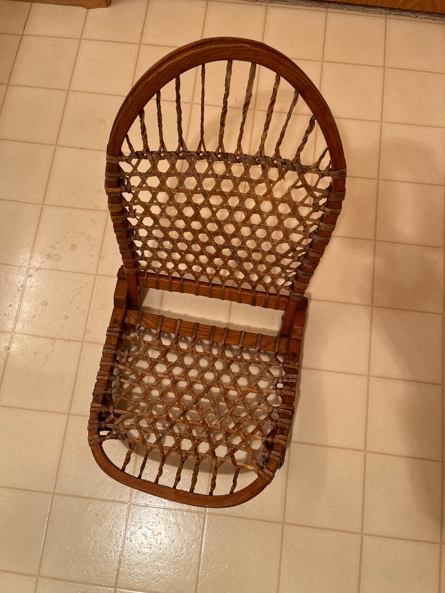 This is a W.F. Tubbs "Sno-Shu" folding canoe chair/seat. They are from the early 1900s, originally from Norway, ME (company founded there in 1907), then later from Wallingford, VT. They made snowshoes also, and like their snowshoes, these are made of steam-bent ash with woven rawhide. The chairs/seats came with multiple "leg" configurations. Yours appears to be one of the shorter models. They can be used in the floor of the canoe, or shorter ones might be sat up on the existing canoe seat but with any height at all, this could make the canoe unstable. They were also used as camp chairs, doing double duty when taken on a canoe trip.