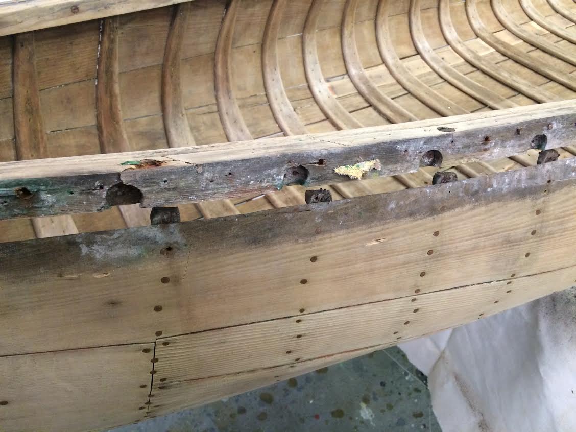 This picture shows the bottom face of the inwale; a the kerf of a saw splitting a drilled board would have run along the face of the inwale at the top of the picture.