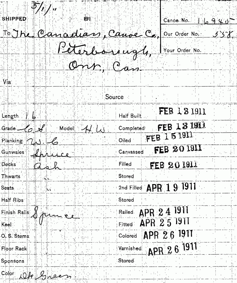 Welcome, the Old Town canoe with serial number 16945 is a 16 foot long, CS (common sense or middle) grade, H.W. (Heavy Water) model with red western cedar planking, closed spruce gunwales, ash decks, ash thwarts, ash seats, and spruce outside finish rails. It was built between February and April 1911. The original exterior paint color was dark green. It shipped on May 1st, 1911 to Peterborough, Ontario, Canada. A scan of this build record can be found below.